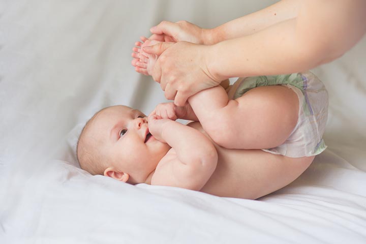 아기를 등으로 누우게 하고, 한 손으로 배와 골반을 지지하세요. 다른 한 손으로 아기의 다리를 잡습니다.
